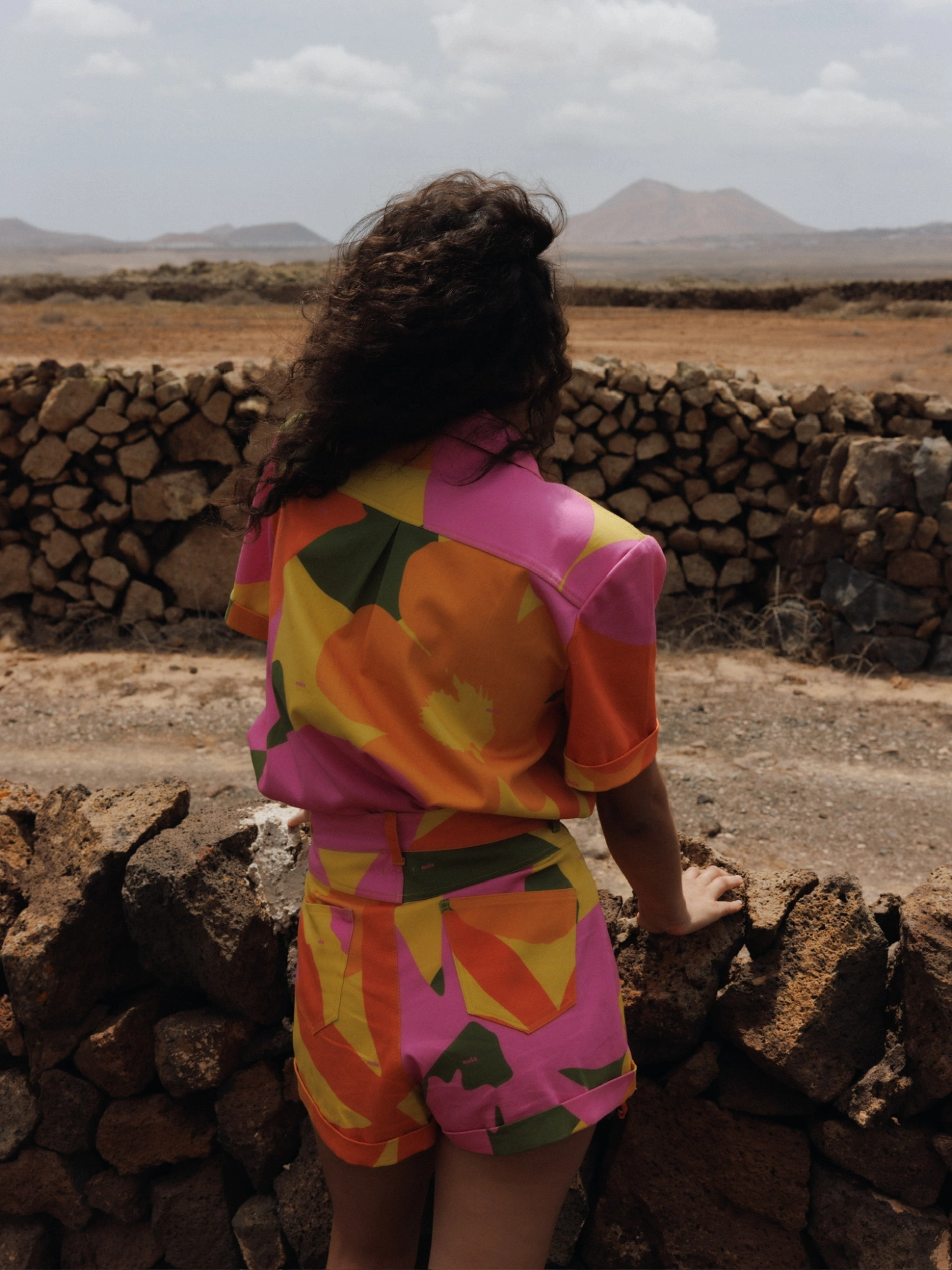 Pudełkowa koszula wykonana z mięsistej, sztywniejszej i elastycznej bawełnianej tkaniny. Krótkie rękawy z wąskimi mankietami, kołnierzyk i dwie ozdobne kieszenie na biuście. Do tego zapięcie na charakterystyczne zatrzaski i unikatowy print. Narzuć na pasujące bikini, dodaj dedykowane SZORTY i wakacyjny outfit gotowy.